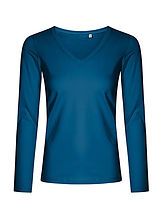 Elegantné, jednoduché a minimalistické dámske tričko s dlhým rukávom a výstrihom do V. Materiál je veľmi elastický, mäkký a príjemný na dotyk, čo zaručuje česaná bavlna. Zosilnené ramenné švy poskytujú dodatočnú pevnosť a odolnosť, zatiaľ čo ozdobné dvojité prešívanie pridáva dojem elegancie a detailnosti. Postranné švy zaisťujú lepšie tvarovanie a pohodlie, zatiaľ čo úzky strih podčiarkuje ženskú siluetu a dodáva celkovo štíhly vzhľad.