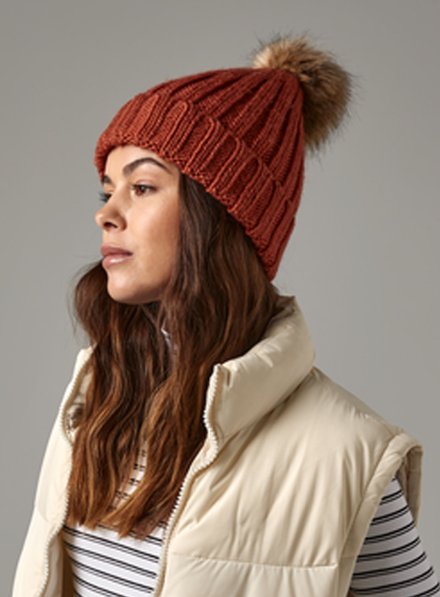 Teplá čiapka s brmbolcom. Vďaka silnému rebrovanému úpletu je veľmi hrejivá. Šmrnc jej dodáva odnímateľná brmbolca z umelej kožušiny, ktorá sa hodí pre každého, komu sa páči kožušinový vzhľad, ale nemá srdce na to nosiť výrobok z naozajstného kožúšku. Na čiapku je navyše možné pripnúť iný brmbolec podľa vašej voľby. Čiapka je dostupná v mnohých farebných variantoch.